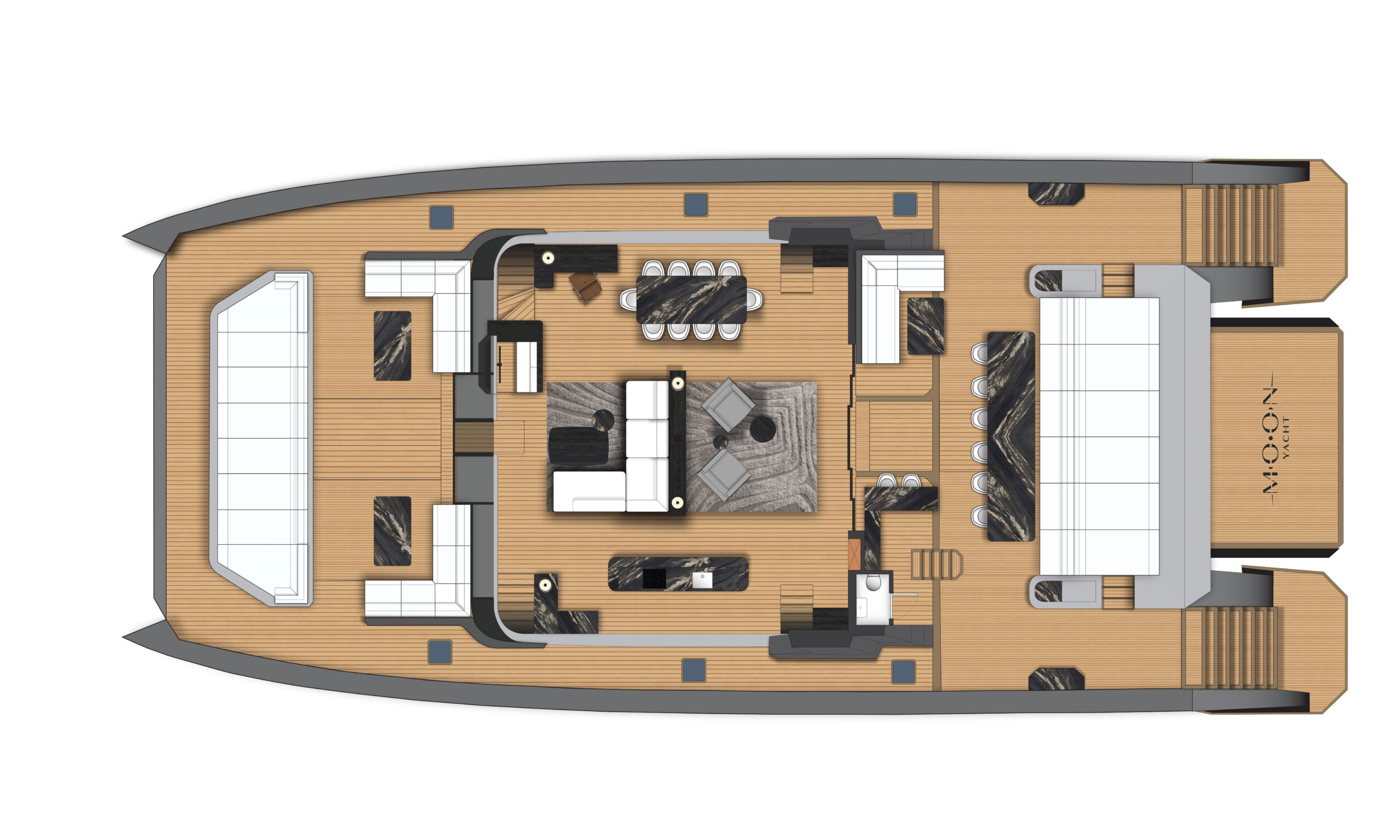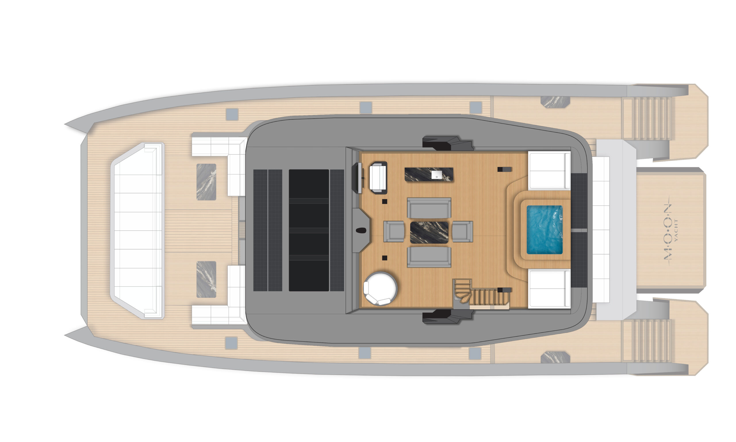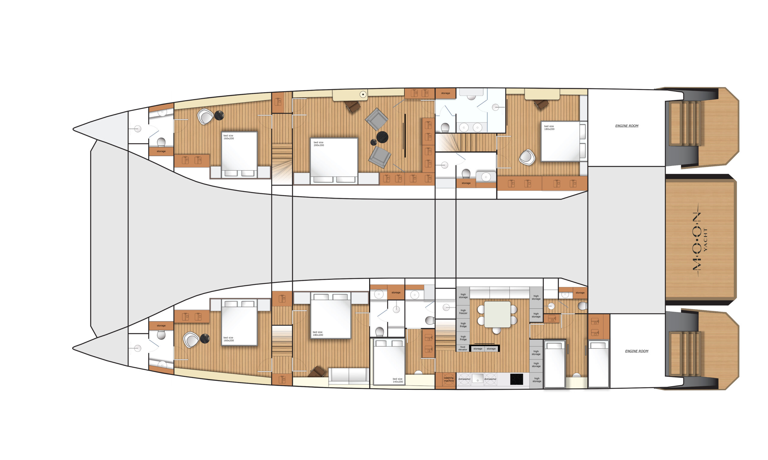 MOON 100 to jednostka, która pozwala na pełną personalizację wnętrz, dzięki współpracy z przyszłym właścicielem. Każdy szczegół – od układu przestrzennego, po wybór materiałów – powstaje w zgodzie z osobistymi preferencjami. Zastosowanie najwyższej jakości materiałów, takich jak naturalny kamień, drewno najwyższej klasy czy wysokiej jakości tkaniny, sprawia, że każdy pokład katamaranu emanuje elegancją. Przemyślana aranżacja przestrzeni zapewnia maksymalną funkcjonalność, tworząc przestronny salon, strefy wypoczynkowe, jadalnię oraz otwarty bar, który stanowi centrum życia na pokładzie. Przestronność tej jednostki pozwala na pełną swobodę w aranżacji, co daje przyszłym właścicielom możliwość wykorzystania swojej kreatywności.